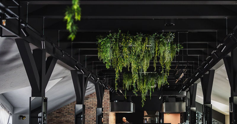 Wnętrze restauracji wyróżnia się industrialnym stylem loftowym, w którym dominują wysokie sufity, metalowe akcenty i naturalne drewno. Duże okna wpuszczają mnóstwo naturalnego światła, umożliwiając podziwianie otaczającej zieleni i spokojnych wód stawów. Przestronne sale oraz taras widokowy tworzą idealne warunki do relaksu i delektowania się atmosferą miejsca, niezależnie od pory roku.